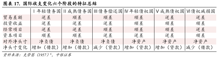 19世纪70年代,凯尔恩斯指出一国的国际收支在经济发展过程中往往朝着不同的阶段演变。1948年,萨缪尔森提出了国际收支四阶段假说,认为随着收入的不断增长,一个国家会经历年轻成长型债务国、成熟债务国、新兴债权国和成熟债权国四个阶段。1957年,克劳瑟进一步将四个阶段扩展为六个阶段,分别为年轻债务国、成熟债务国、债务偿还国、年轻债权国、成熟债权国和债权减损国。不同阶段的国际收支特征各异(见图表17)。