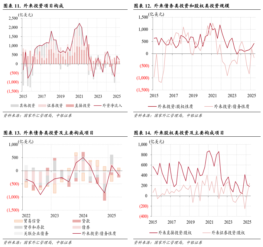 上半年,外来债务类和股权类投资净流入规模此消彼长。其中,外来债务类资金同样呈现分化态势,股权性质的外来证券投资和直接投资净流入规模同比齐增,表明特朗普关税政策对外资来华投资意愿影响有限。